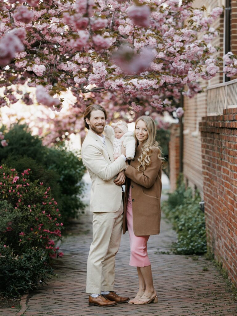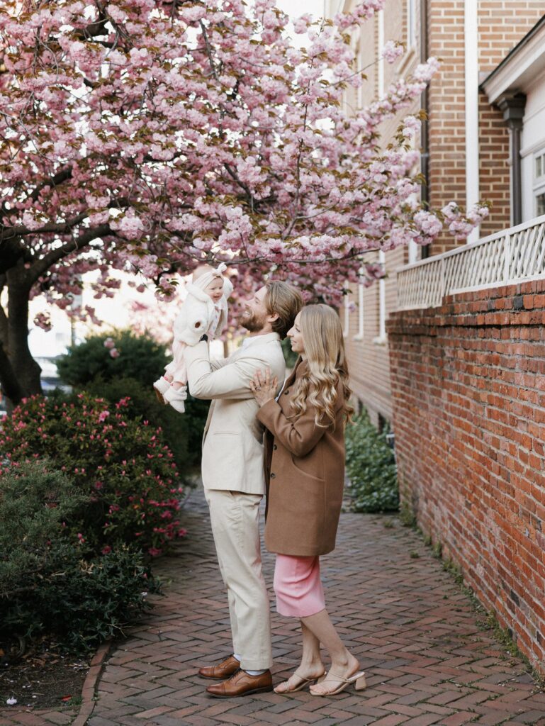 Cherry blossom season in Old Town Alexandria always feels a little magical. We timed this family mini session during that brief stretch when the trees were in full bloom and spring was just beginning to show itself. We wandered brick sidewalks, paused beneath flowering branches, and let the moments unfold naturally — simple, relaxed, and exactly what makes this season so special.