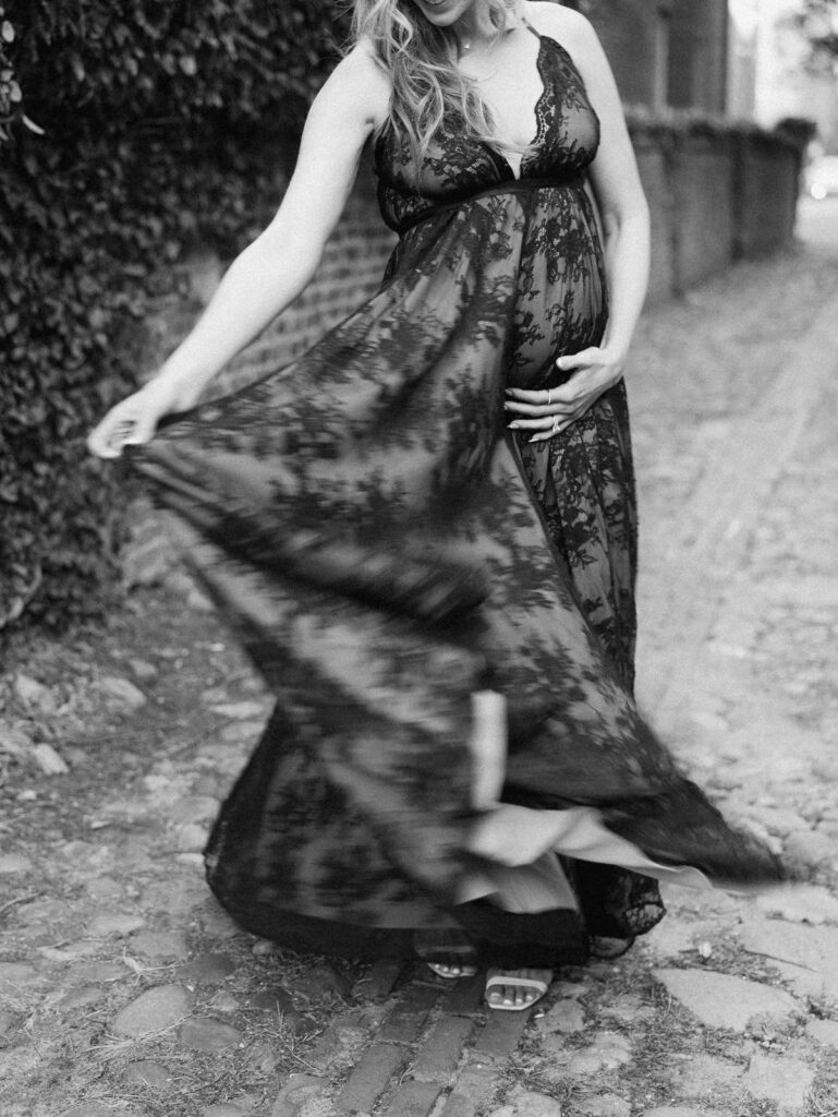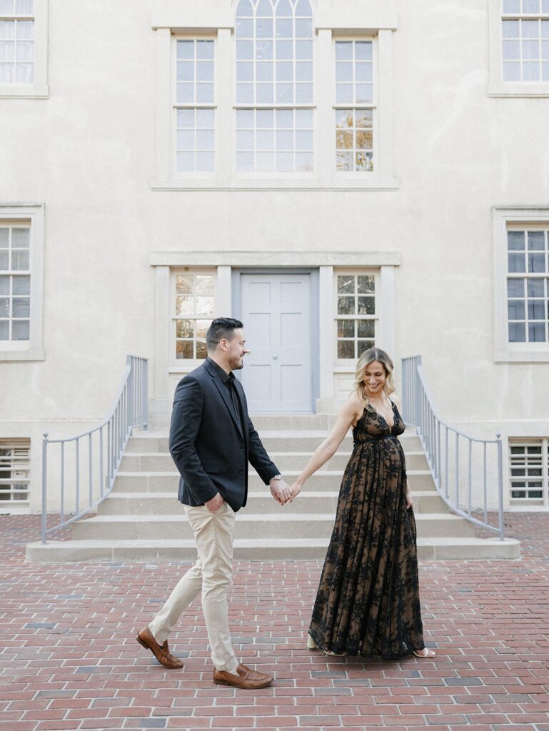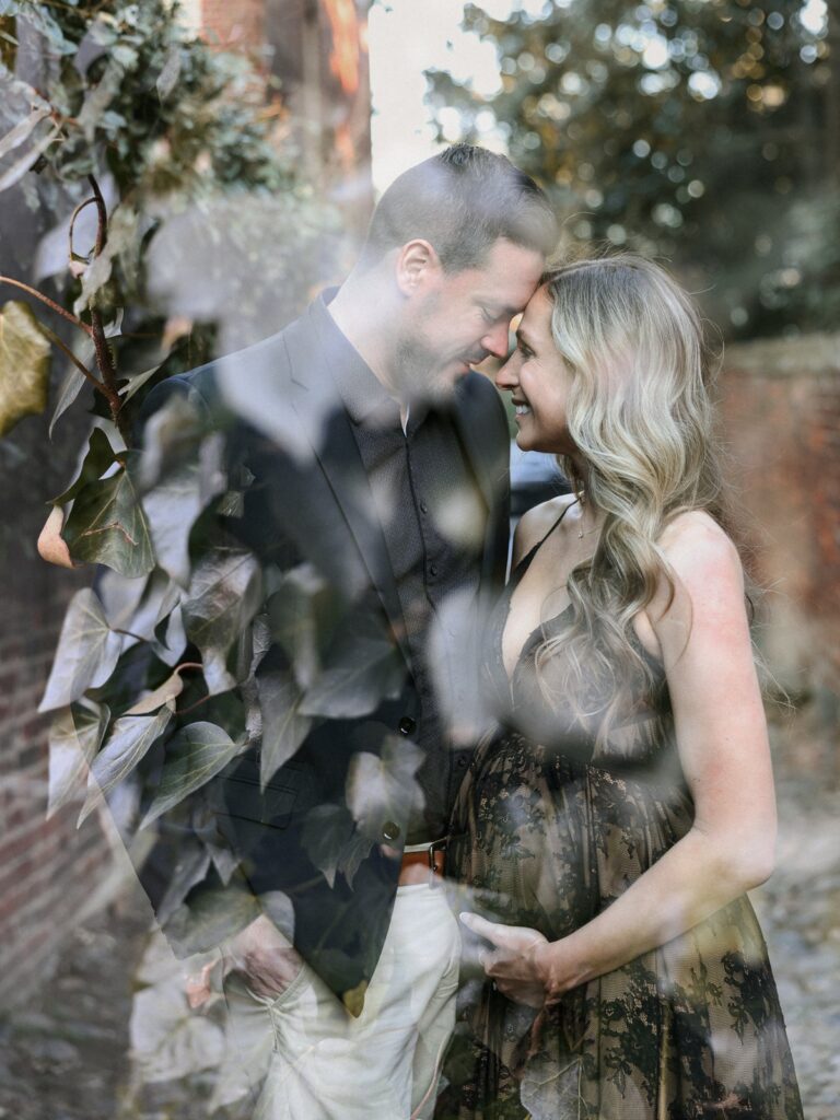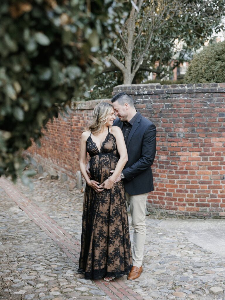 Set among the Carlyle House, historic streets, and waterfront of Old Town Alexandria, this maternity session blended timeless architecture with quiet, intimate moments. Inspired by the couple’s wedding venue, we moved through garden paths, cobblestone alleyways, and along the water, creating imagery that feels romantic, refined, and deeply personal. We also leaned into moments of playful direct light, using sun and shadow to add depth while keeping the overall feel soft and natural. The result is a session that honors both place and season, capturing the beauty of this chapter as it unfolds.